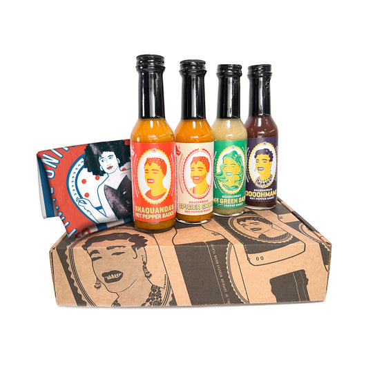 Try our first four sauces! Shaquanda's Original Hot Pepper Sauce, Oooomami, Mx. Green Sass, and Spicier Smoke, and get into AN INFINITE UNIVERSE OF FINELY SPICED FLAVOR with not only the sauces, but also with our exclusive Shaquanda dish towel in your kitchen :-)